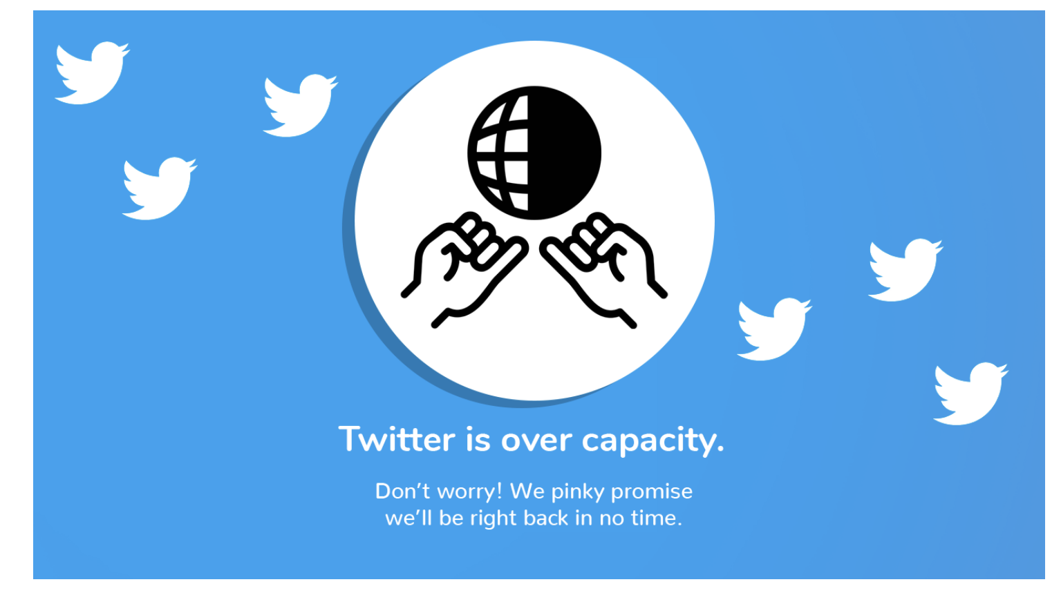 Twitter has a popular downtime screen to let users know that the site is overcapacity. Called the Fail Whale, it shows a whale being playfully airlifted by Twitter birds, with the short error message below.