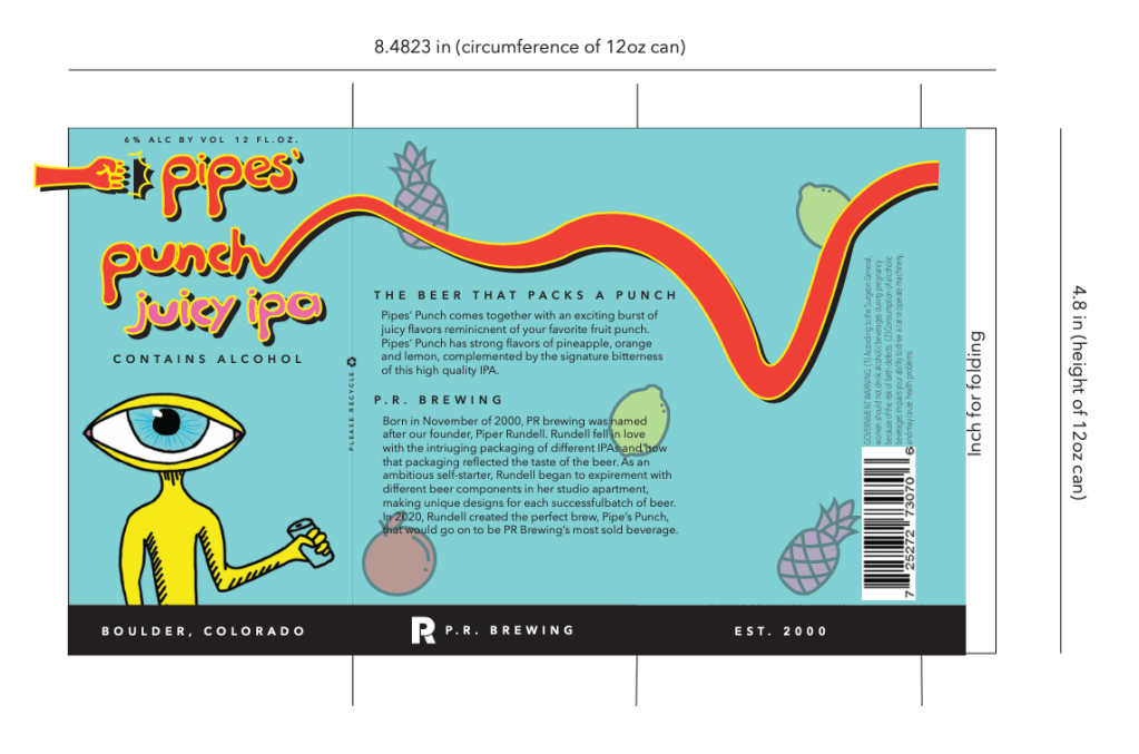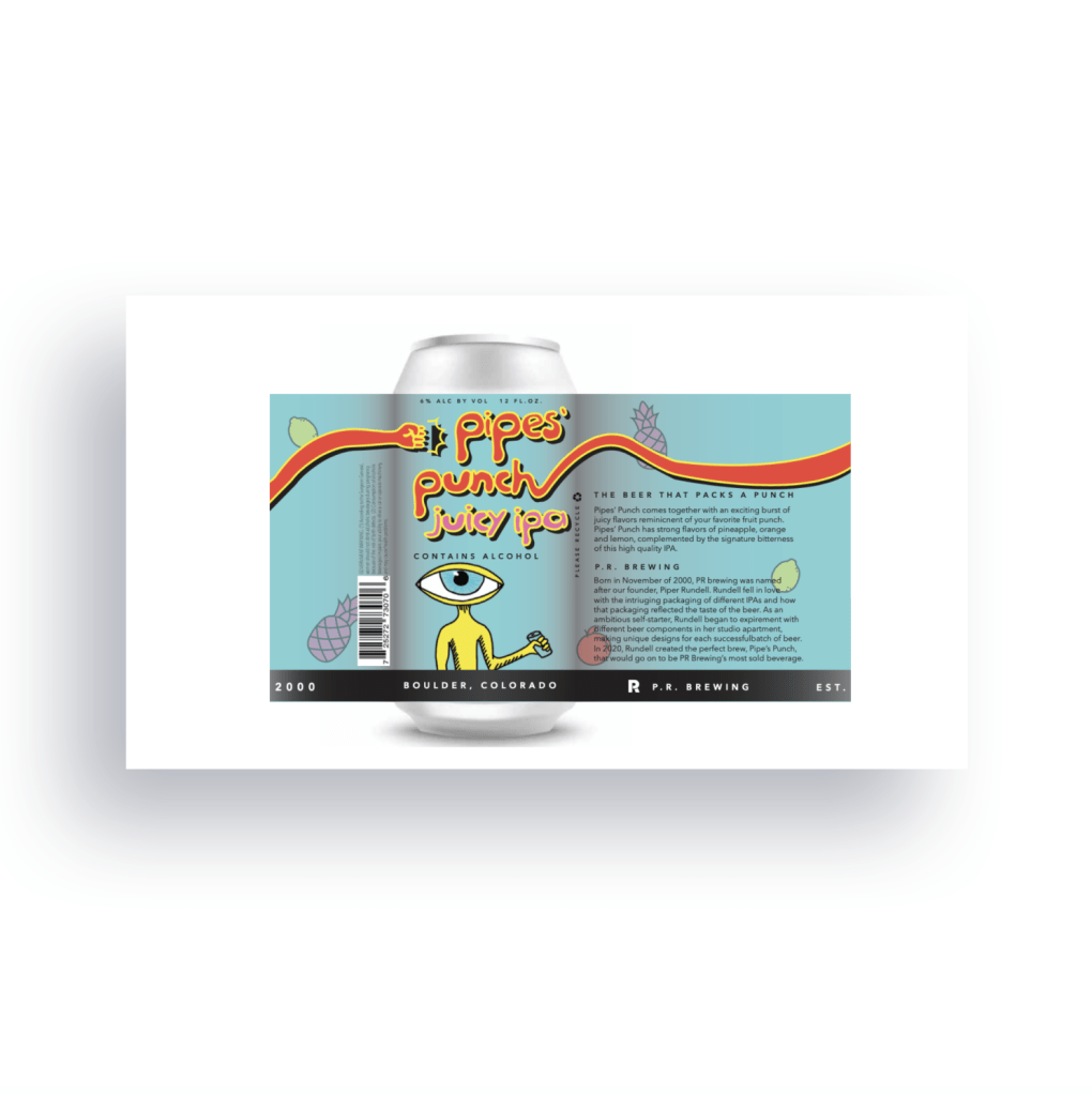 I then created a design guideline for the brand with the color palette, title design, content, and background, and a sort of “mascot” that would be featured on the product. The design came together with a playful and youthful association to punch, contrasted with a little bit of quirky edginess linked to IPAs and their enjoyers.