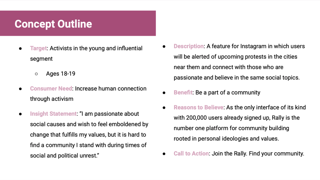 Using research and insights gathered over 4 months, we determined that Rally would be an integrated extension of Instagram. As many of our target users utilize Instagram for sharing infographics related to their opinions and social views, and posting donation links to causes they are passionate about, Instagram was the perfect platform to integrate with Rally.