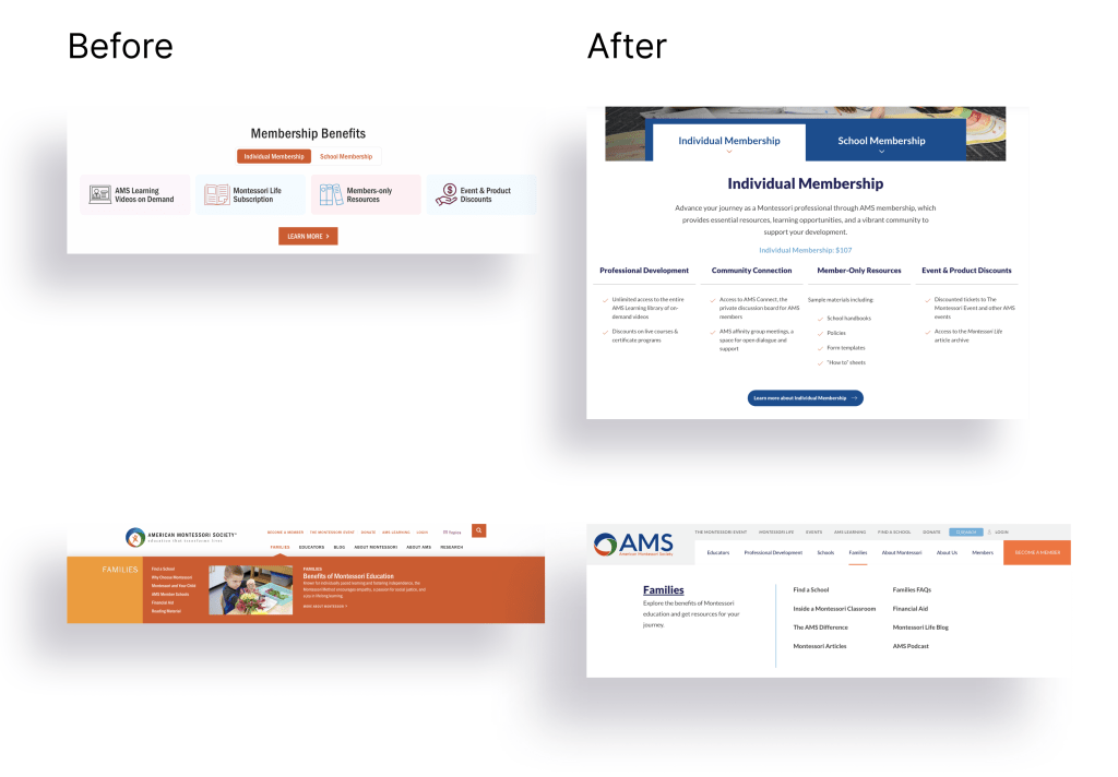 AMS needed to address declining site traffic, high page abandonment, and a disjointed user experience across diverse audience groups—parents, educators, administrators, and adult learners. The Amsive web development team set out to construct a seamless, intuitive, and engaging online experience that supports membership growth and content accessibility.